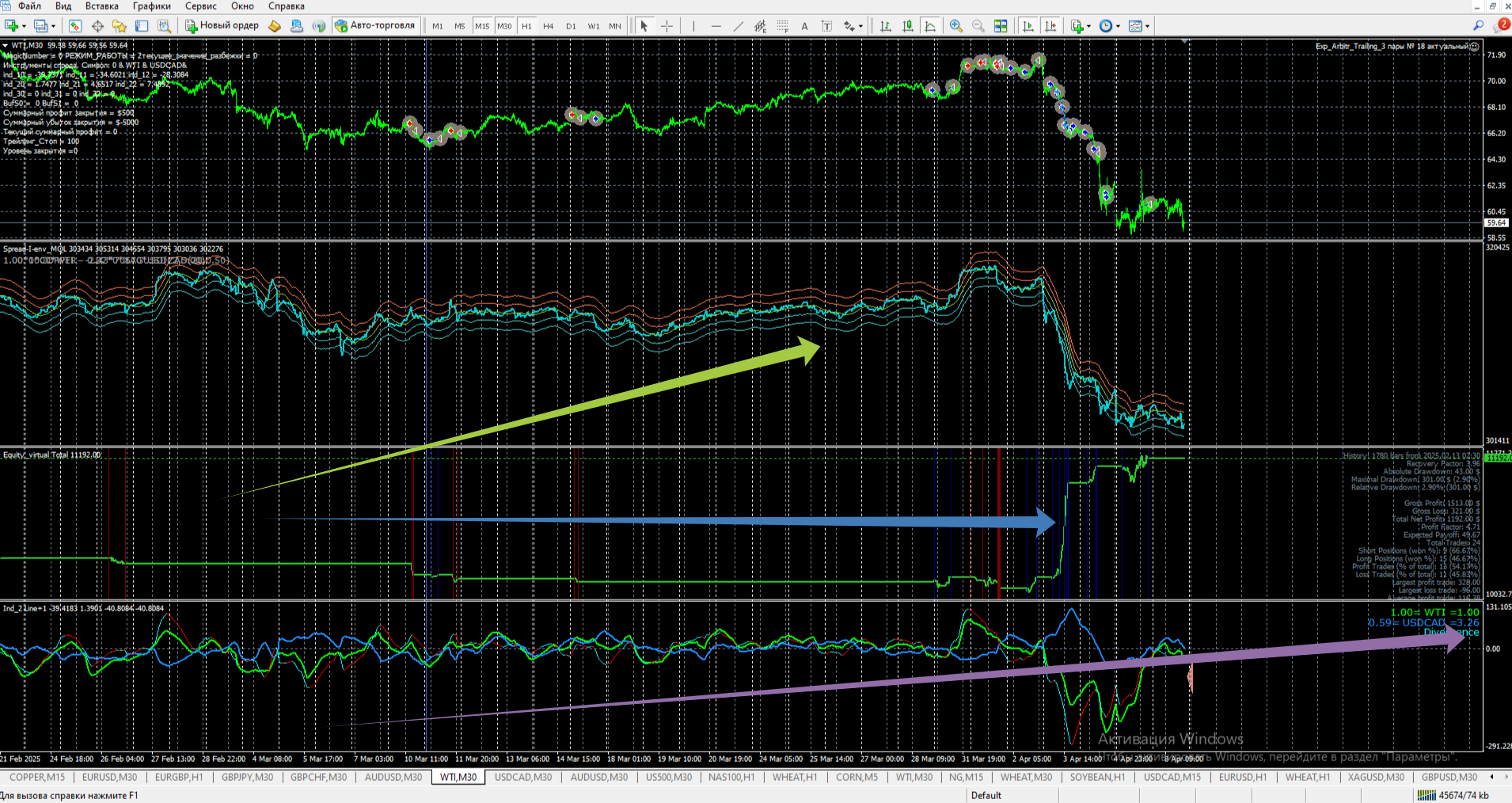 синяя стрелка - эт о итоги торговли роботом синуса.
