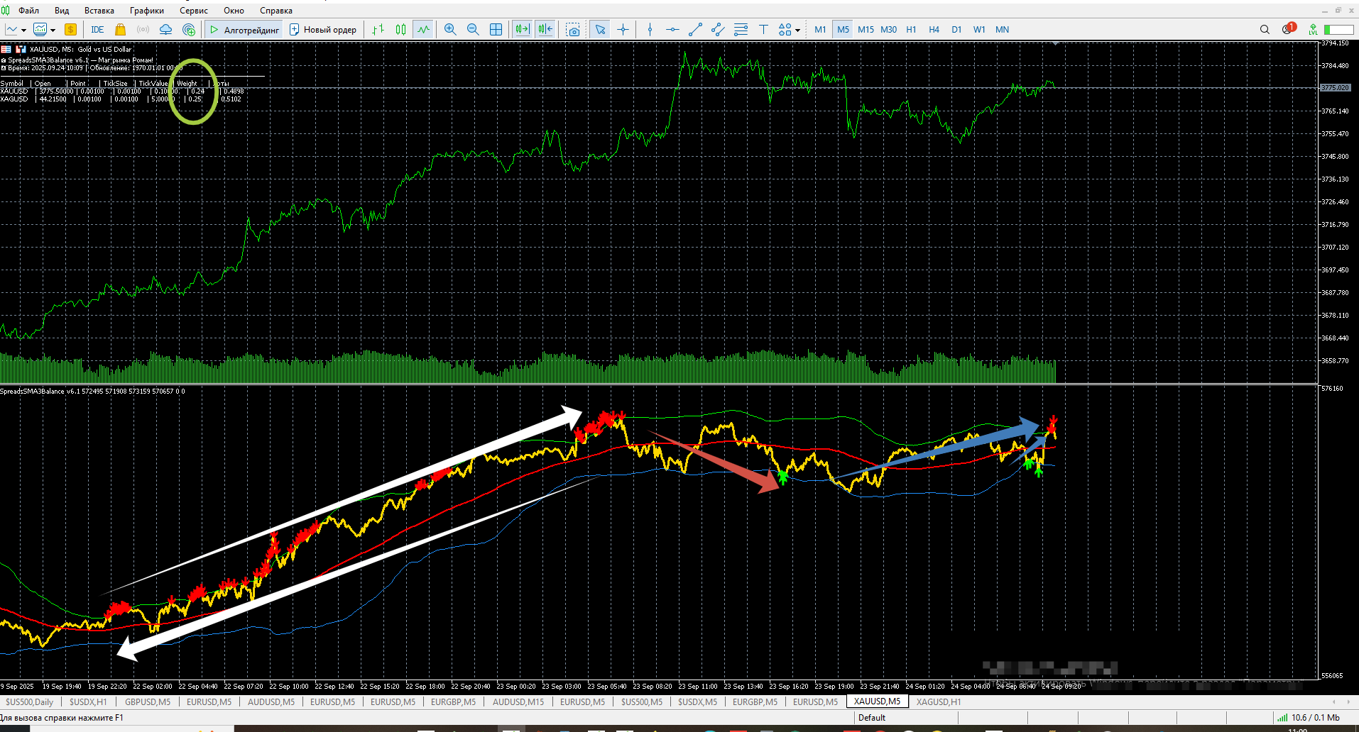 вот такую трендовую составляющую надо исключать белые стрелки это металлы серебро золото на равных объемах почти