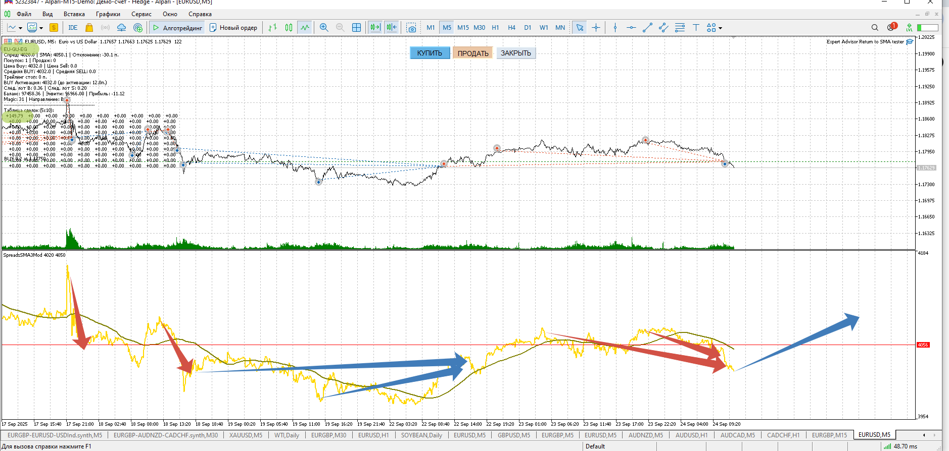 Зачем искать синус, границы коридоров, пытаться найти периодичности в случайной величине эквити синтетика и т.д., если можно торговать синтетик в сторону МАшки его эквити?