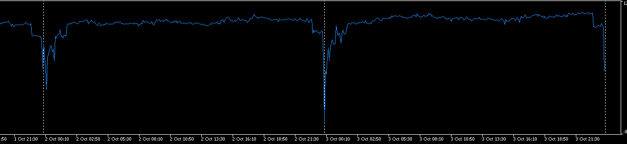 Эквити Кольца восстанавливается к двум часам ночи, и снова падает в 22:50 ... 22:55, причём каждый день ступенчато: через час падает(растёт) ещё раз, теперь до дна(вершины).