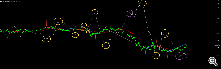 Из-за таких взаимных сдвигов получается что когда попали в естественный цикл, то разворот изолинии производной это торговый сигнал он примерно в то-же время что и разворот цены.