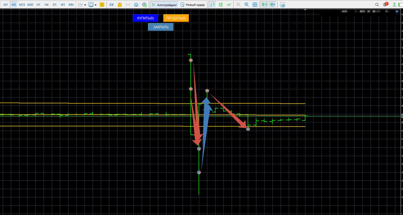 красные стрелки - закрытие покупки - продажа! синие стрелки - закрытие продажи - покупка! В синусе торгуется одно направление - покупка или продажа ВСЕГО СИНУСА - по символам синуса могут быть разные позиции.