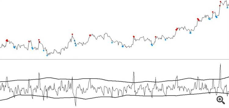 видно что кривая быстро возвращается к середине после резкого выброса, а цена в это время флетит.
