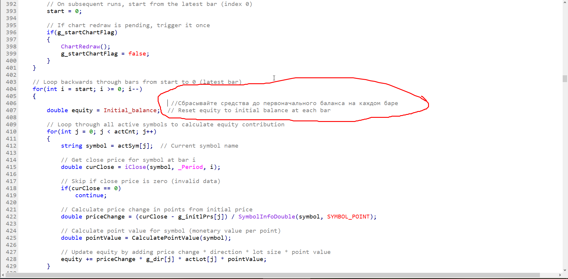 Но я не поверив в чудо я все же решил "зазырить" код и к "несчастью" нашел эту строчку(для тех кто не понимает в программирование экви "обнуляется" на каждом баре).