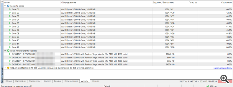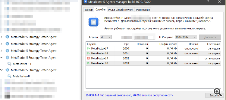 После запуска службы и добавления агентов появляются задачи по количеству запущенных ядер (почему-то из 4 в данном случае запустилось только 3!)