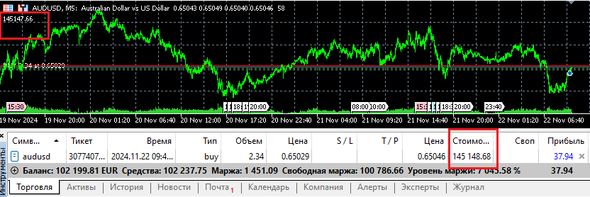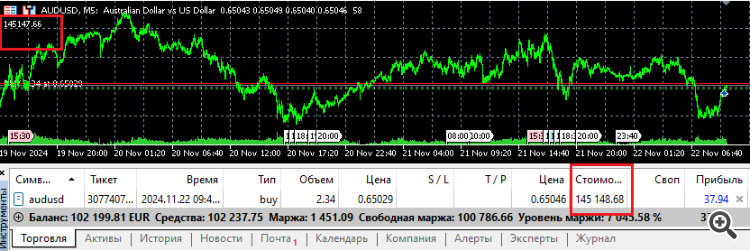На скрине показано, что открыта одна позиция - AUDUSD на EUR-счете.