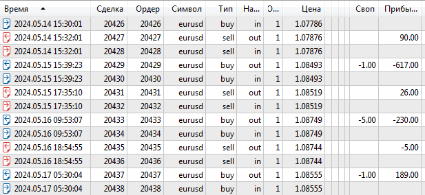 Отчеты Тестера не показываю длительность сделок. Вот те же сделки из нормального отчета: (видно, что позиция жила менее 1 дня, а не 3-5 дней)