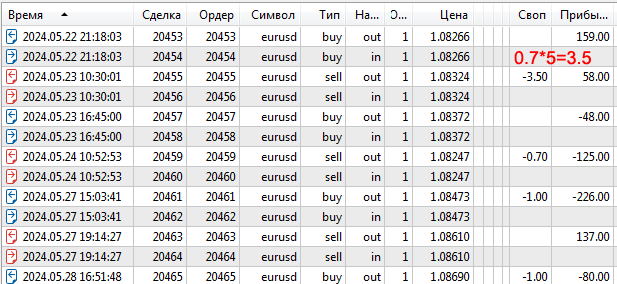 По Sell все дни берет по 1 свопу = 0.7, а 2024-05-23 5 свопов: