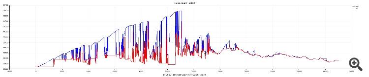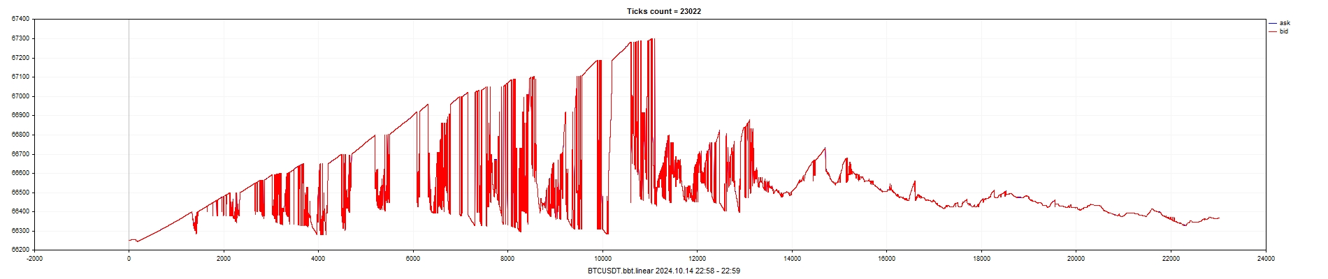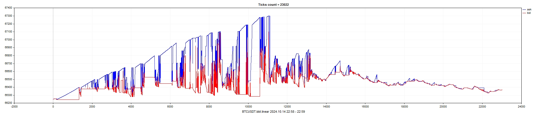 На предыдущем скрине я подтягивал цену аск к бид с разницей в 1 пункт и наоборот, т.к. в онлайне (и на второй половине графика) видно, что маркет мейкер это делает. Но как видно на представленном примере не всегда успевает. В итоге у меня бид с аском резко прыгали вместе на тысячи пунктов, поэтому эксперт и торговал на них с огромными проскальзываниями.