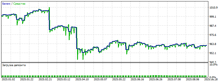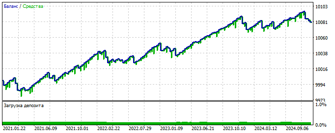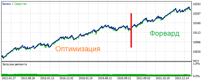 Причём, чем злостнее ошибка потерь, тем эффективней. Предполагаю, что такое будет действовать только там, где нет никаких закономерностей, а просто действует эффект накопления нерабочих паттернов, которые стремятся на дистанции "отработать" свои 50 на 50: то есть, на обучаемом участке мы намеренно "кошмарим" нейросеть, чтобы на форварде она статистически "выровнялась". Нейросеть как будто становится "слепой" к шуму. Этакая экстремальная версия регуляризации: сеть не успевает "запомнить" даже шум, оставаясь в зоне максимальной неопределённости, что в условиях хаоса работает как стабилизатор.