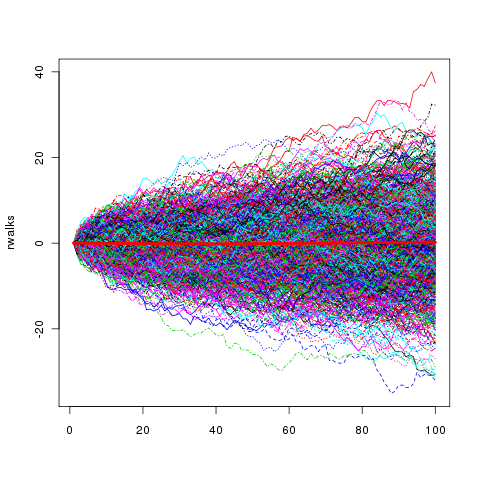 Ниже, 500 моделируемых случайных блужданий со средним значением (белый) и ± одно стандартное отклонение выделено красным цветом. Стандартное отклонение увеличивается на корень из t: