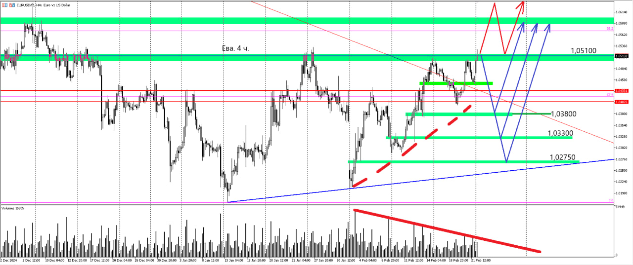 Ева. день. Цена находится на границе зеркального уровня. Так же можно обратить внимание на то, что идет "поджатие" к этой границе и напрашивается вывод, что будет пробой этого уровня и дальнейшее "восхождение" цены. Но есть одно НО.... На 4 часовом графике отчетливо видно, что объемы падают. Это может свидетельствовать о том, что силы на исходе. И под большим вопросом, что цена сможет преодолеть рубеж 1,05000. На скрине указал 3 точки, до куда цена может сходить вниз.