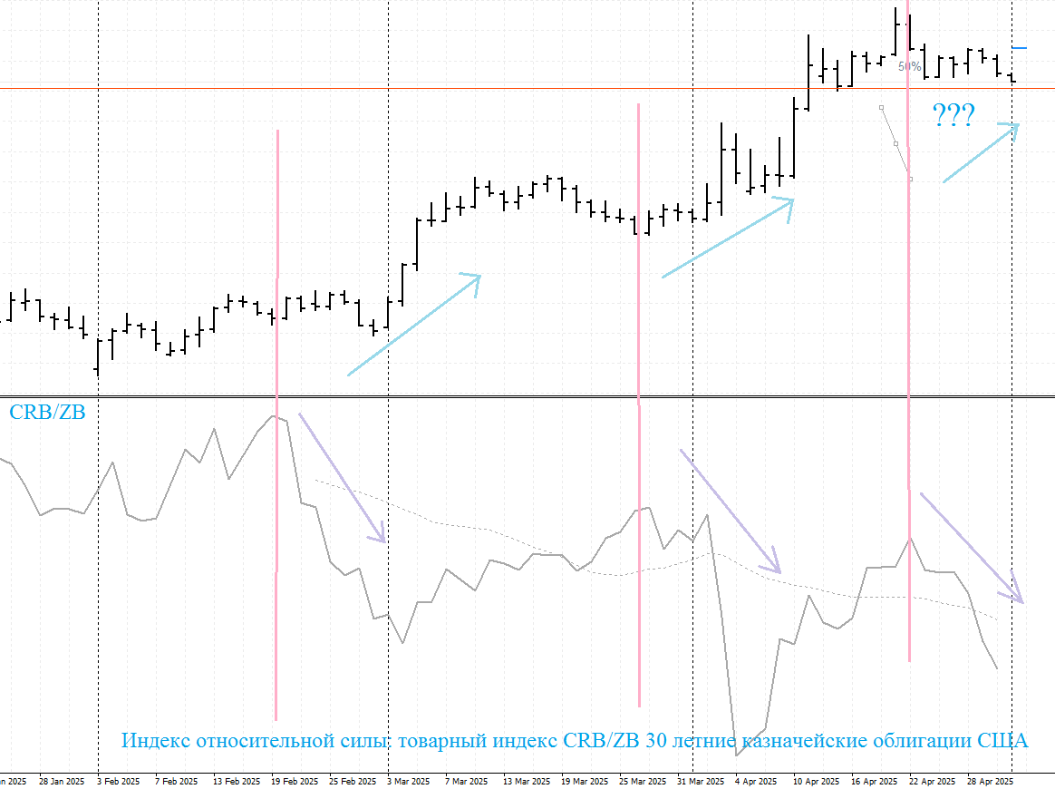 но несмотря на это я побоялся продать пару. индекс относительной силы CRB/ZB указывает на то что возможно сегодняшний разворот на daily скорей всего обернется коррекцией (собакой Баскервилей) и мы увидим продолжение тренда вверх. то что я вижу на втором рисунке это не то что я хотел бы видеть чтобы продавать пару. но я повторю опять. это не прогноз и не рекомендация к действиям. это всего лишь мое видение ситуации по EUR/USD.