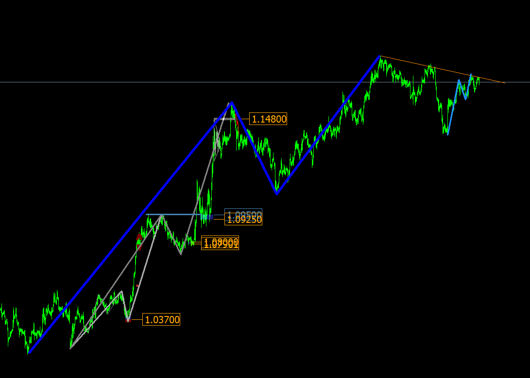 Долгосрочный тренд вверх ещё в силе, но находится на приграничной зоне, чтобы либо перейти в коррекцию ко всему тренду (среднесрочный поход вниз), либо закончить коррекцию в раках последней подволны всего тренда и пойти дальше вверх.