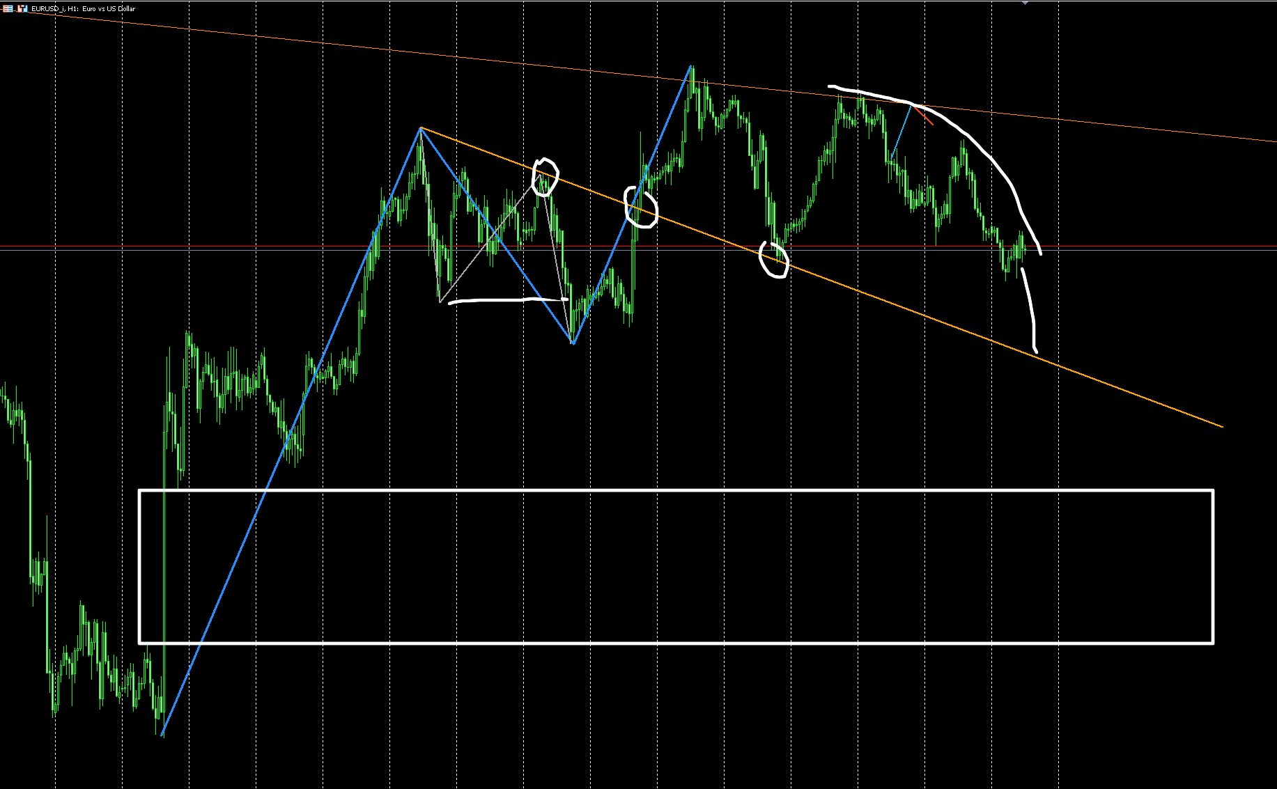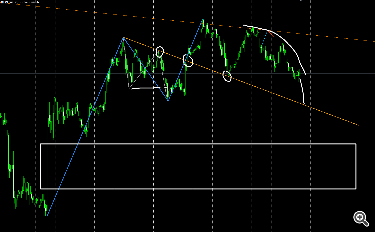 3) Дугой указан паттерн, похожий на ускорение: сперва размеренная АВС, а затем потенциальная авс меньшего порядка, но пока не состоялась (состоится после пробитися последнего нижнего экстремума)