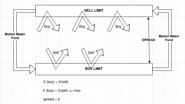 при этом никаким прогнозированием он почти(*) не занимается, ориентируется на свои результаты, если перекос по объёмам - подвинет плашку (одну или обе). Объемы сравнялись - попробует сузить чтоб увеличть оборот. Если оборот недосточный - расширит чтобы компенсировать спредом и будет хаотично искать где глубже.