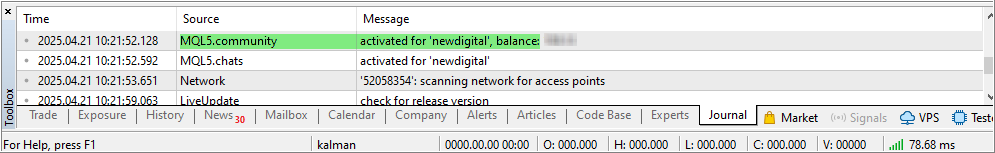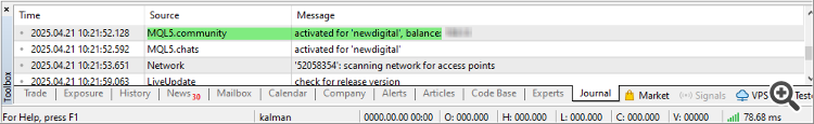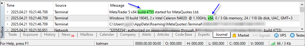 Там написано, что на моем ноутбуке Windows 10, и он 64-бит (МТ5 не работает на 32-битных системах), и ниже в журнале - видно, что я заполнил вкладку Сообщество в Метатрейдере: