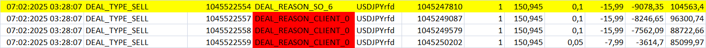 Через сделки получаю информацию о причине проведения сделки, и вижу, что при стоп-ауте закрыли только первую сделку по DEAL_REASON_SO , а остальные будто я сам закрыл...
