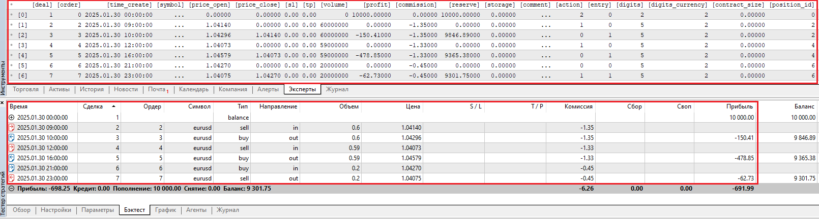 #include <fxsaber\SingleTesterCache\SingleTesterCache.mqh> // https://www.mql5.com/ru/code/27611 #include <fxsaber\MultiTester\MTTester.mqh> // https://www.mql5.com/ru/code/26132 void OnStart() { uchar Bytes[]; if (MTTESTER::GetLastTstCache(Bytes) != -1) // Если получилось прочитать последнюю кеш-запись одиночного прогона { const SINGLETESTERCACHE SingleTesterCache(Bytes); // Загоняем ее в соответствующий объект. ArrayPrint(SingleTesterCache.Deals); // Распечатываем сделки. /* const int Size = ArraySize(SingleTesterCache.Deals); for (int i = 0; i < Size; i++) Print(SingleTesterCache.Deals[i].ToString()); */ } }
