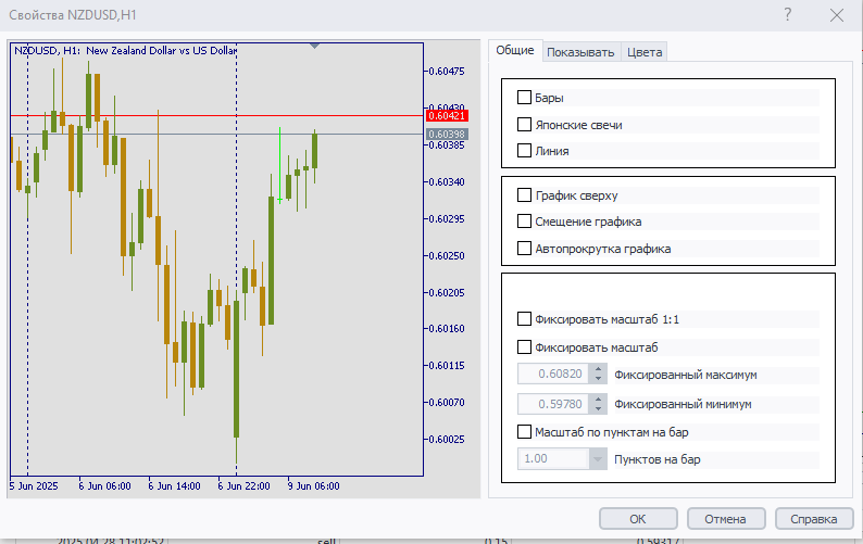 Ни один чекбокс не отмечен, но тем не менее график «японские свечи» и отображены разделители периодов, линии Bid и Ask.