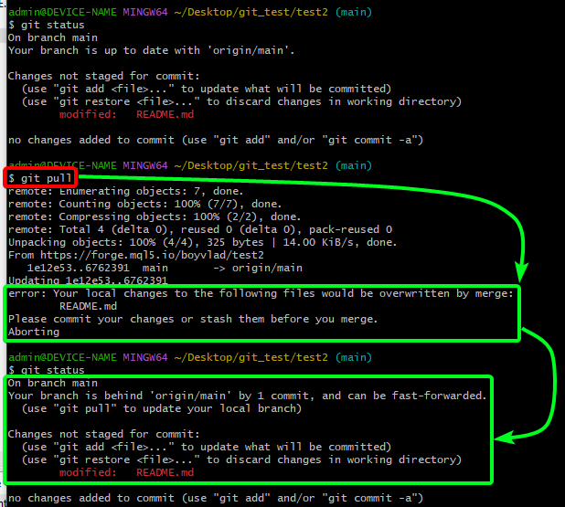 Это жесткий косяк от MetaEditor (видеопруф). Я выполнил "$ git pull" из bash, и git любезно предотвратил потерю файла, который находится в состоянии modified: