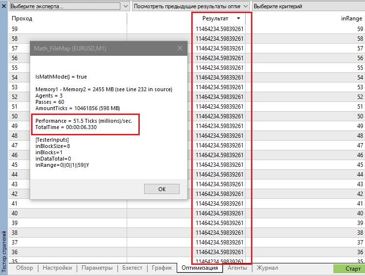 Скоростные характеристики показаны на скрине: 27 секунд шла оптимизация, производительность 8 миллионов тиков в секунду.