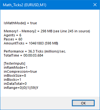 Скорость заметно ниже, но и потребление памяти в три раза ниже, поэтому в 4 гига умещается (bid/ask/time) больше 700-та миллионов тиков. Это около 30 лет тиков, поэтому вопрос хранения тиков считаю закрытым. Старые машины с 12GB RAM теперь могут оптимизироваться на любом количестве агентов по реальным тиками за всю доступную глубину истории в моновалютном режиме.