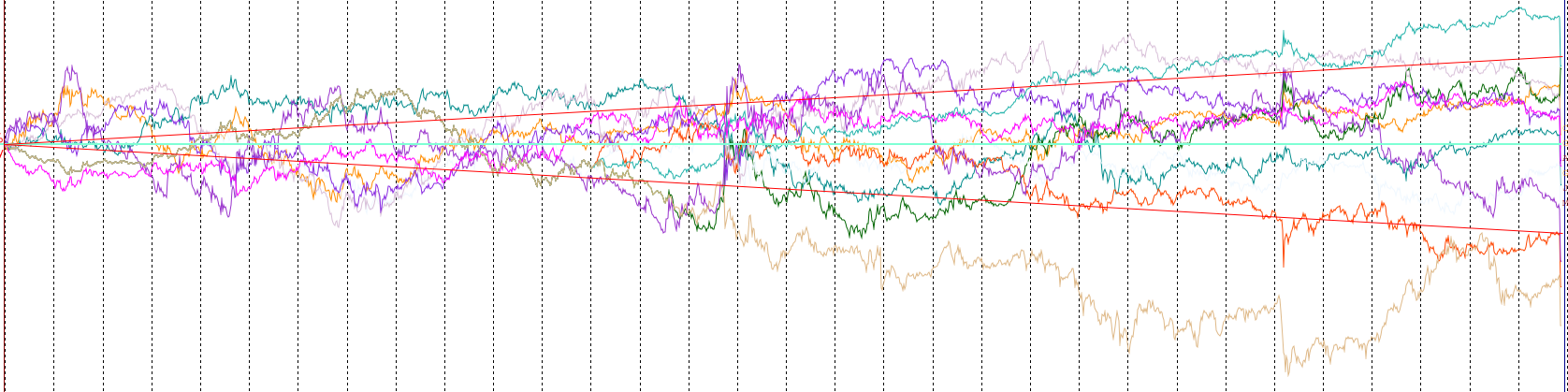 графики (оба) логарифмические, поэтому визуально узкие и почти линейно. Если уйти из логарифмов, будет видна классическая парабола (как тут https://ru.wikipedia.org/wiki/Задача_о_разорении_игрока). Самый сб-шный сб никуда не распоясывается, идёт своим непредсказуемым ходом с дисперсией и мо.