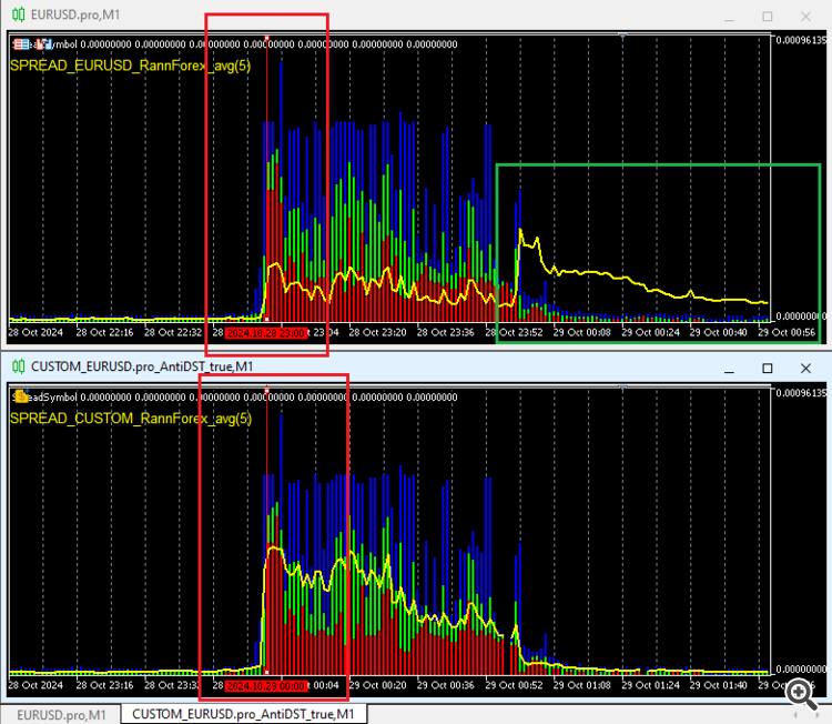 На скрине используется индикатор спреда для реального символа брокера с европейским временем и кастомного символа, полученного через скрипт выше.
