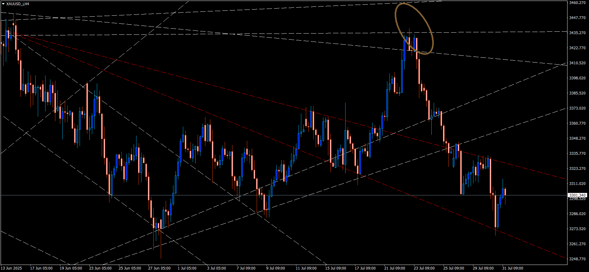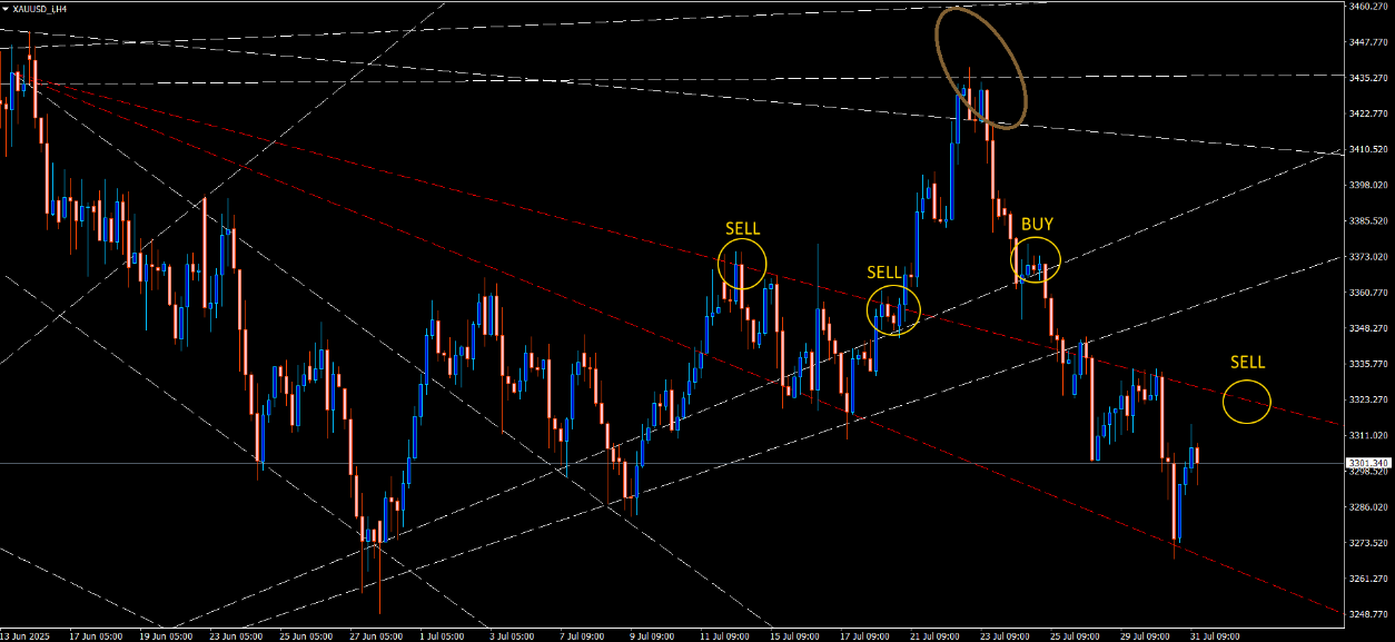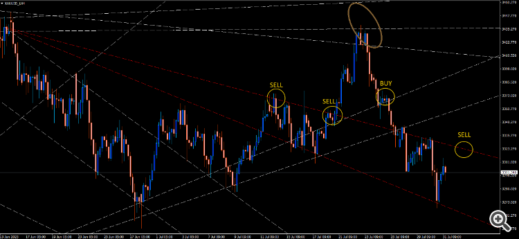 слева направо: 1ый селл - недобор профита, 2ой селл в опе, затем бай, выполненный дороже всех продаж - в просаде