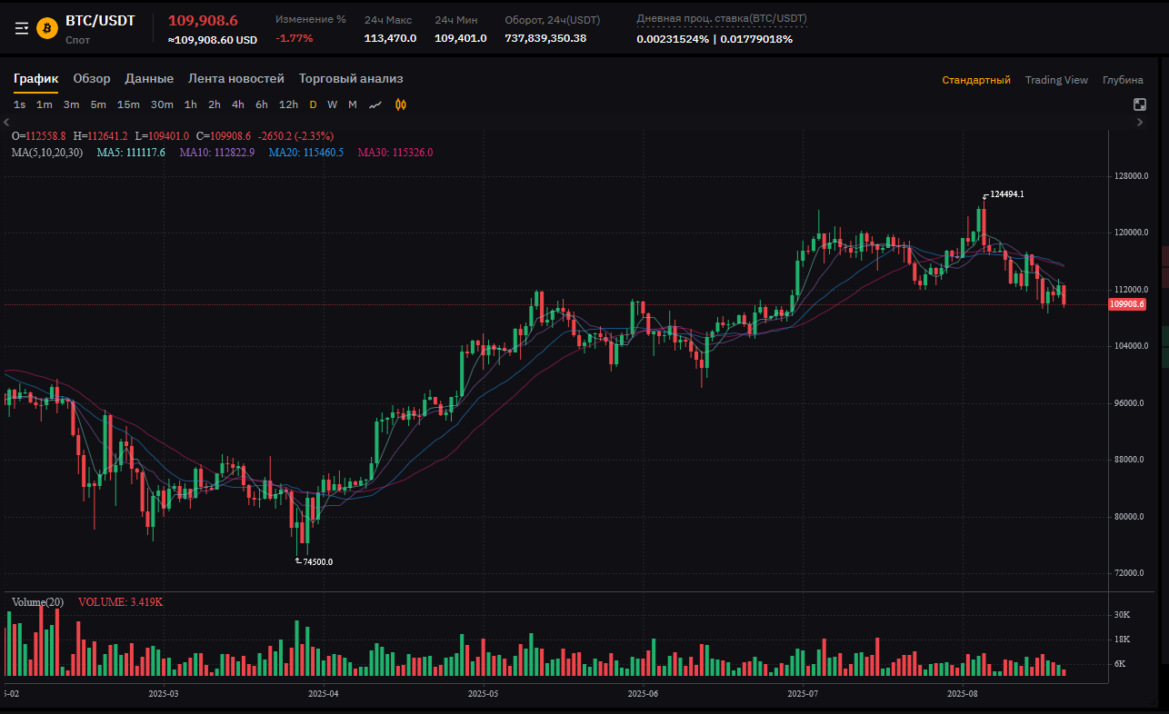 Цена: 109,908.6 USDT (-1.77% за период, нисходящий тренд продолжается).