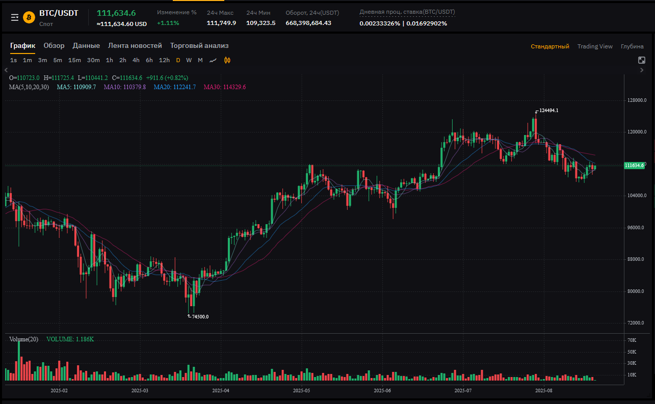 Цена: 111,634.6 USDT (рост +0.82%, попытка восстановления).