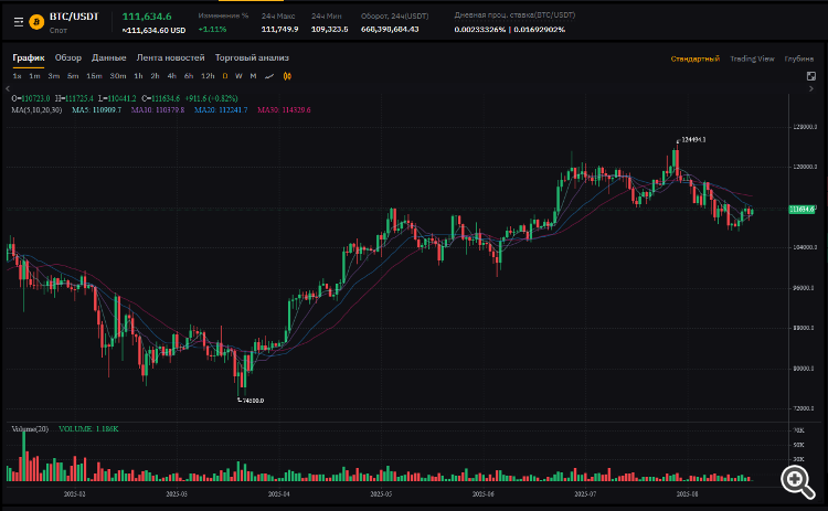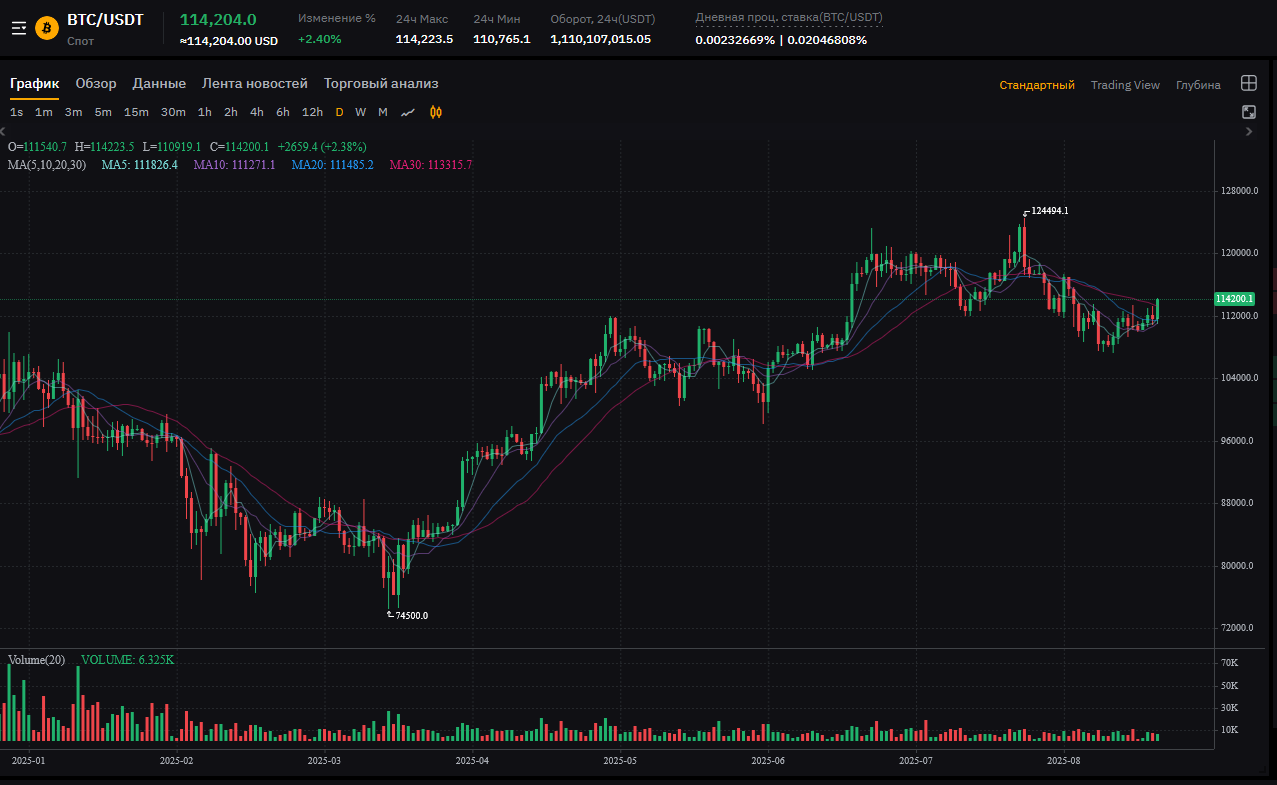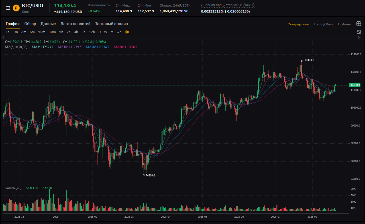 Цена: 114,180.4 USDT (небольшой рост +0.64%, консолидация после роста).