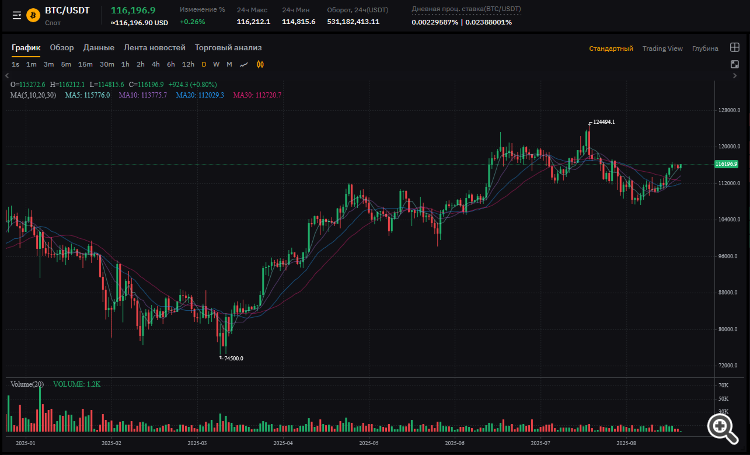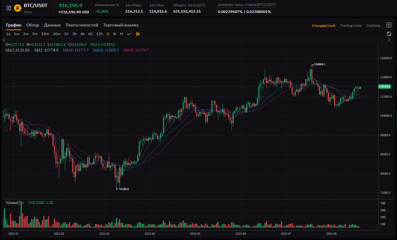 Цена: 116,198.9 USDT (рост +0.80%, продолжение восходящего движения).