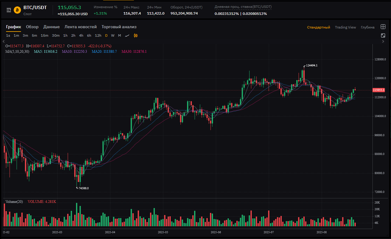 Цена: 115,055.3 USDT (рост +1.31%, продолжение восходящего движения).