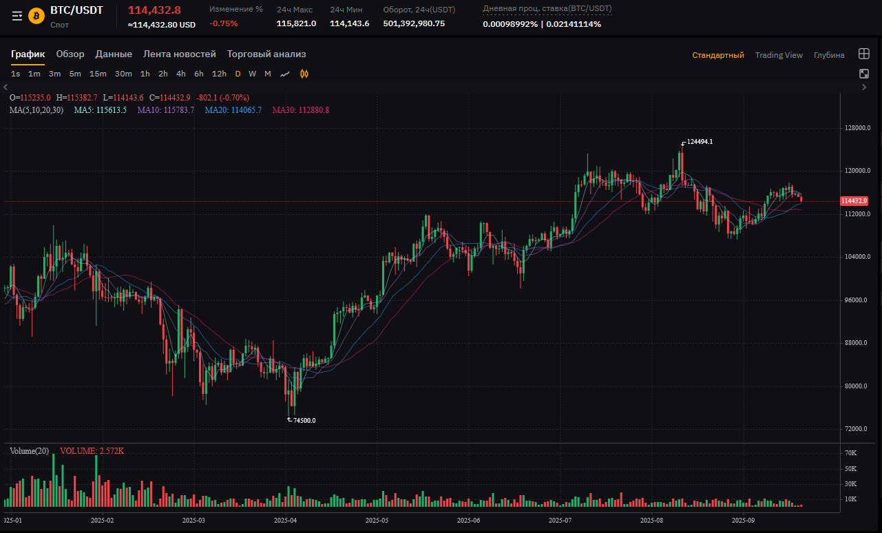 Текущая цена: 114,432.8 USDT (снижение -0.75%, продолжение коррекции).