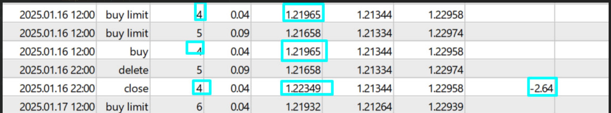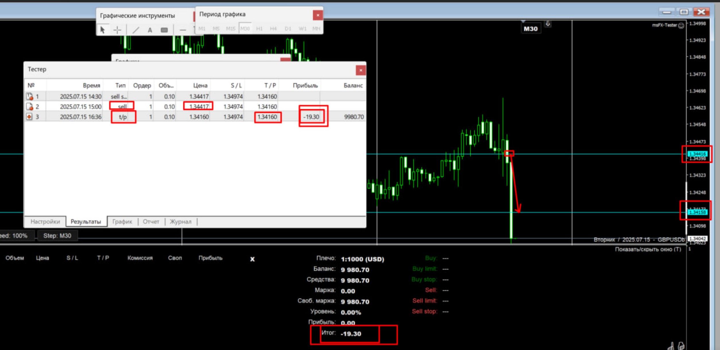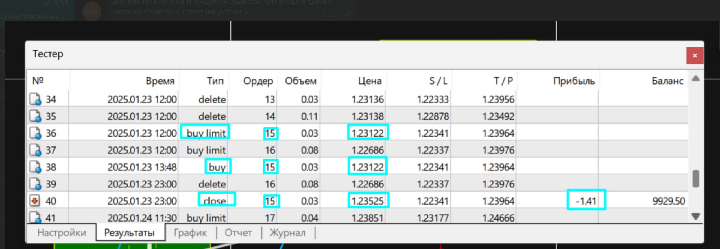 прикрепил пару скринов из журнала и пару с графика, там все наглядно.