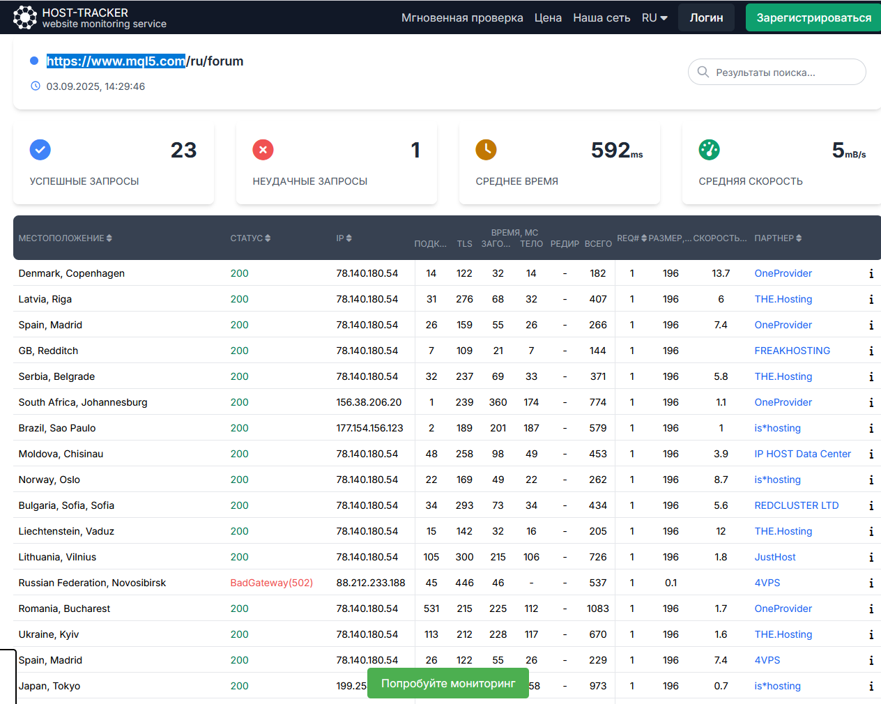Тестировал снаружи адрес сайта с разных городов