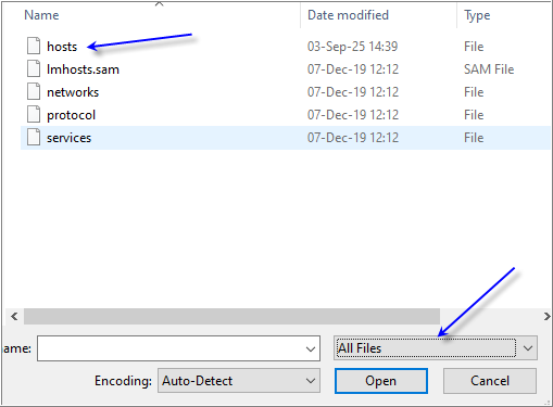 ... и чуть справа вверху будет это слово cmd (вверху - как на картинке), нажать на него правой кнопкой мыши - "открыть от имени администратора" ("run as administrator"), откроется командная строка от имени администратора, потом ввести notepad.exe и нажать Enter, потом в меню пустого блокнота - File - Open - и найти этот host файл (поменять на "all files" как на картинке), найти host файл и открыть его.