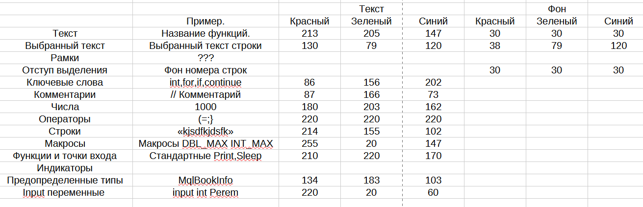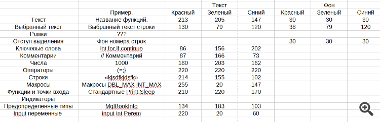 Пытался сделать тему MetaEditor похожую на Visual Studio. Узнавал цвет пикселя в Visual Studio и вносил настройки в MetaEditor. Выкладываю полученные настройки. Единственное, так и не смог понять, что такое "Рамки" в MetaEditor.