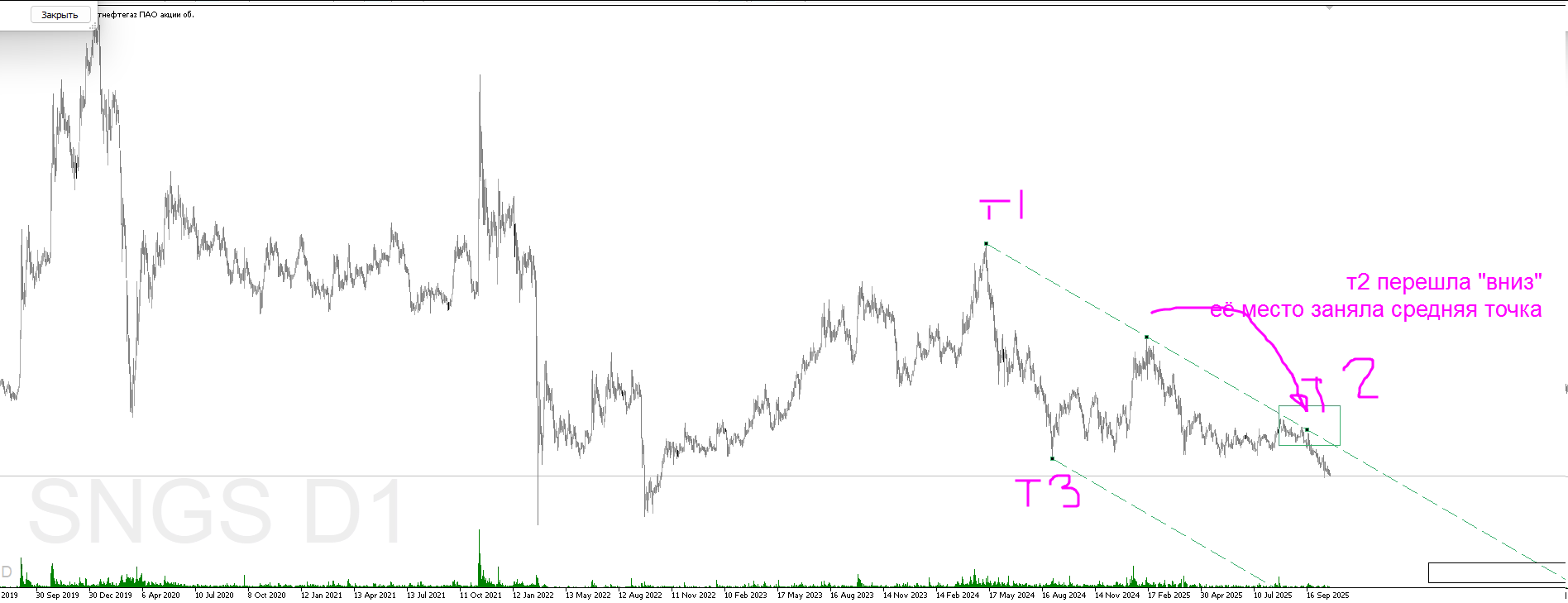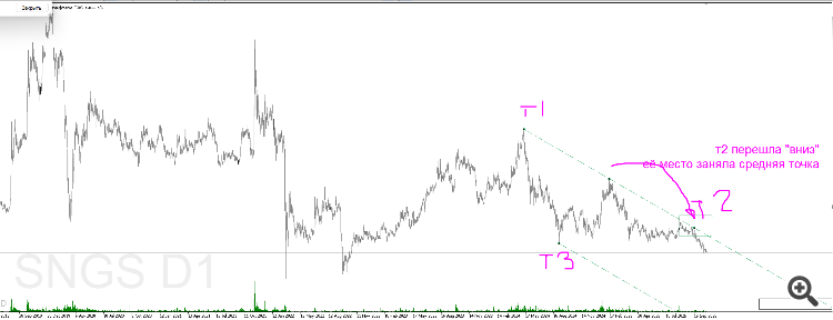 Понял Вас! Попробовал угол наклона сохранить (хотя наверное алгоритмически на одном ТФ можно его сохранить более менее постоянным) таким путём - перенес среднюю точку верхней линии на место второй точки хая, соответственно вторая точка оказалась ближе к текущему времени на D1 и потом посмотрел на H1. Результат порадовал. Спасибо Вам.