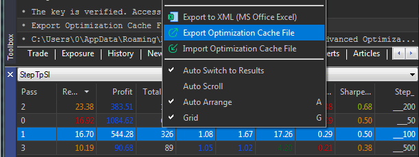 Если открыть теминал и тестер и выбрать советник и один из результатов оптимизации , и попытаться экспортировать .opt файл, то диалоговое окно для экспорта не открывается . При этом файлы в папке с кешами есть. Для экспорта в XML и импорта открываются.