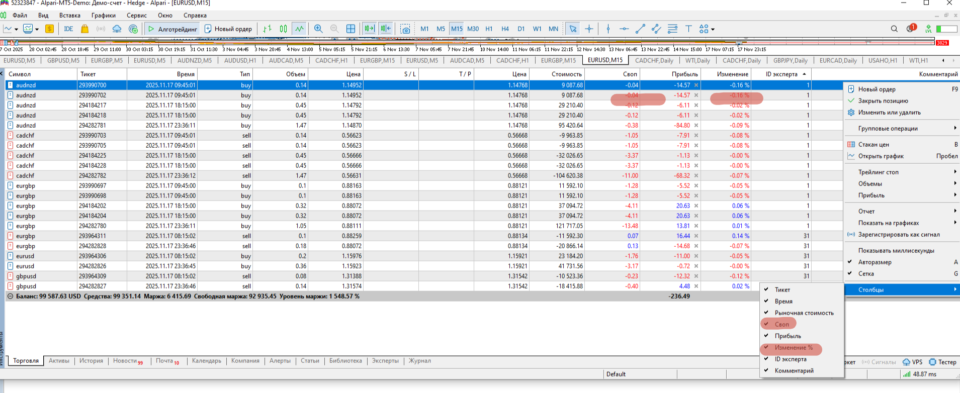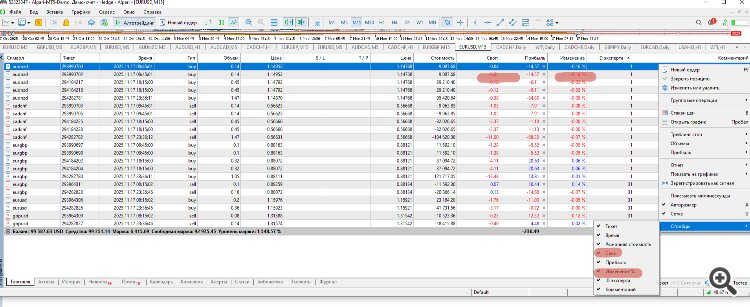 плюс посмотрите и включите отображение всех столбцов - правая кнопка мыши на вкладке "торговля" у вас изменение цены - отрицательное... на счете минус.... свопы - отрицательные также увеличивают минус на счете: