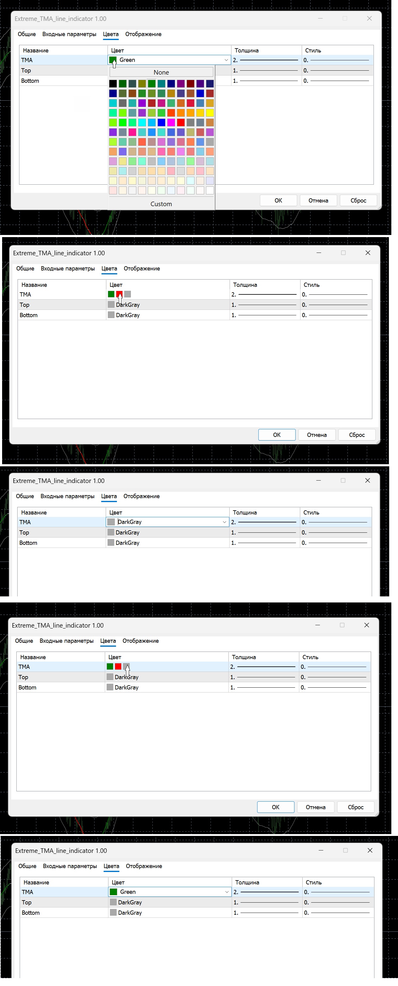 Купил новы ноут с ситемой виндовс 11 поставил терминал, установил на график индикатор...Но когда пытаюсь сменить цвета центральной скользящей средней TMA, нажимаю на квадрат с зеленым цветом всё нормально, а когда нажимаю второй квадрат с красным открывается последний серый, а когда нажимаю на квадрат с серым цветом открывается зеленый.