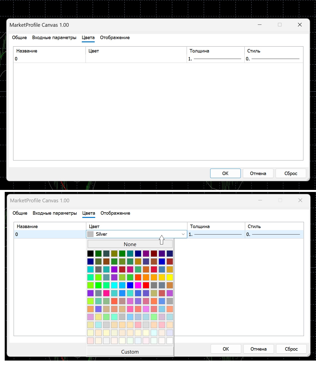 Второй индикатор Marketprofile Canvas100 , заходя в раскладку цвета , в колонке цвета вообще нет цвета пока не нажмешь туда.После нажатия появляется серый,хотя он должен быть изначально виден.