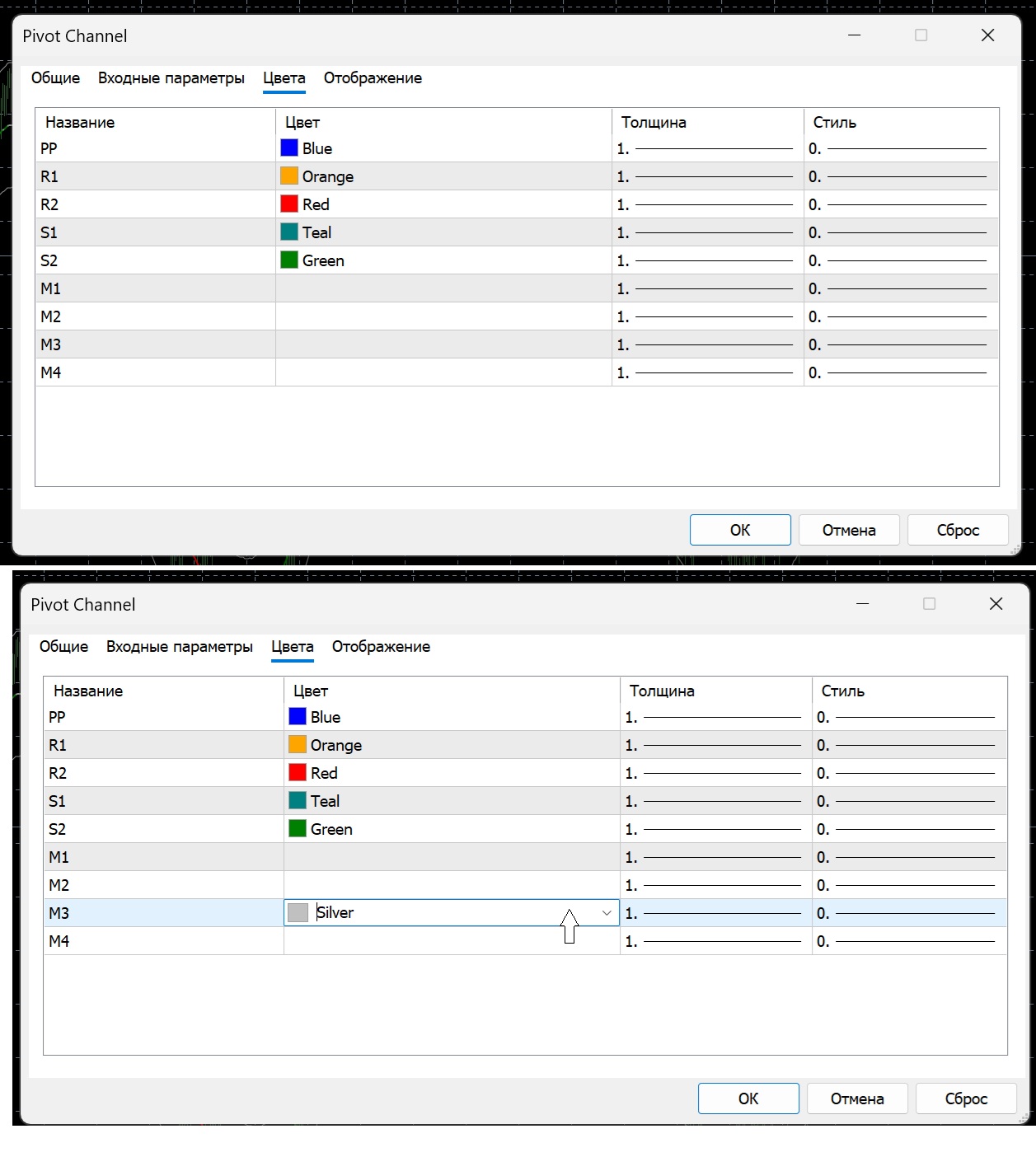 В индикаторе PIVOT CHANELL вообще половина цветов не показывает.И появляются когда на окошки цветов кликаешь.