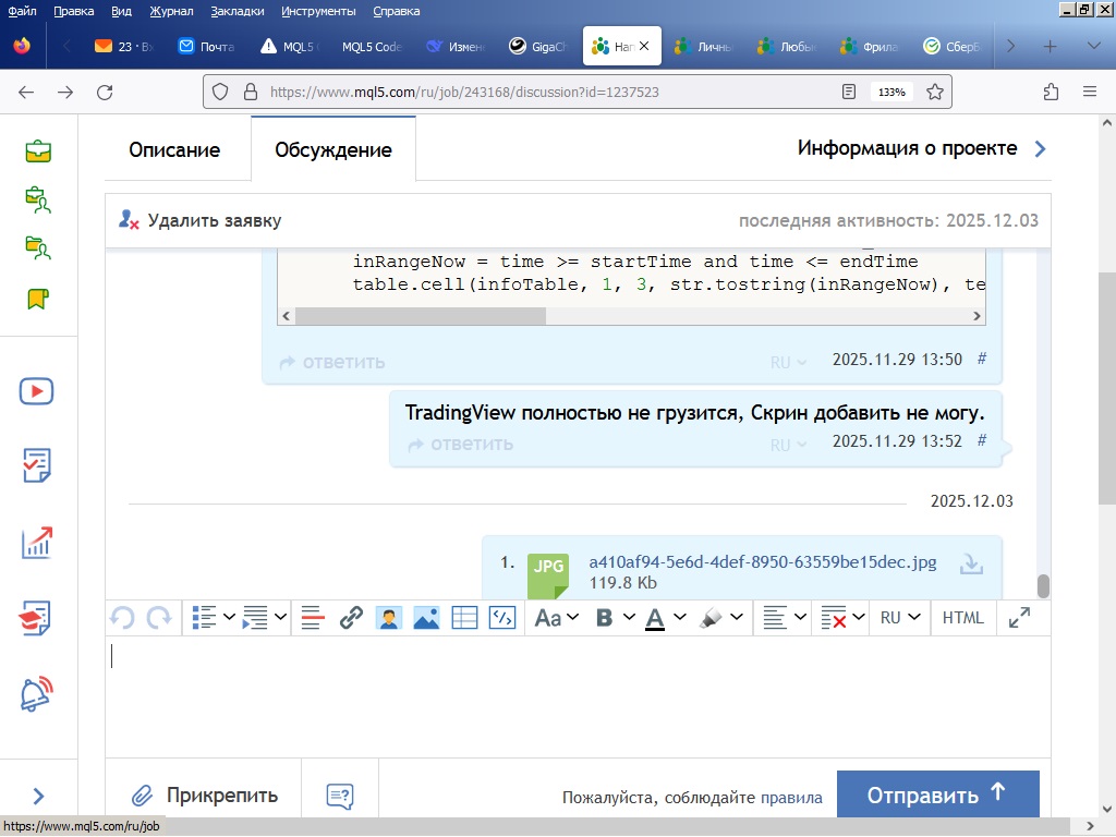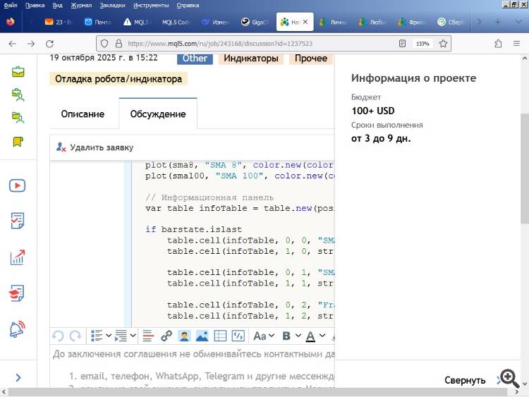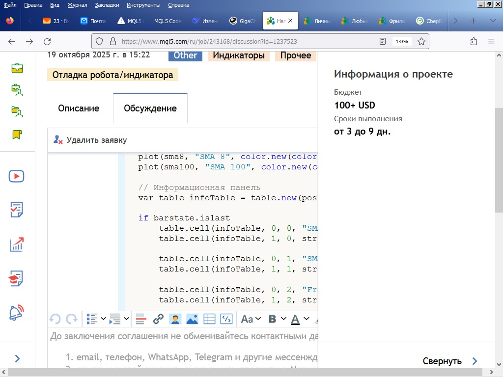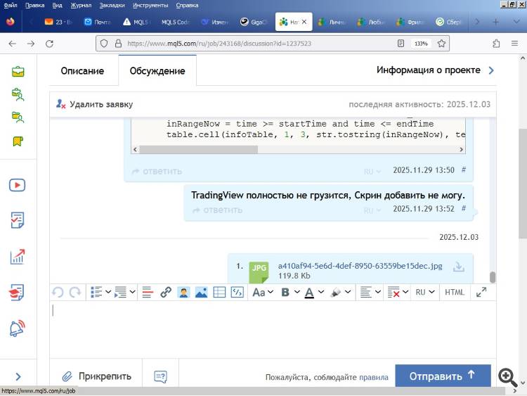 Код и скрин сбросил заказчику. На страничке заказа висит надпись "Отладка робота/индикатора", уже две недели