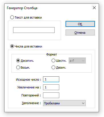 ALT+C – Текст для вставки (задаём "пробел" - это даст пробел между номером строки и строкой) –> Ок