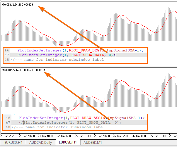 #define SOME_PLOT_INDEX 0 PlotIndexSetInteger(SOME_PLOT_INDEX, PLOT_SHOW_DATA, 0);