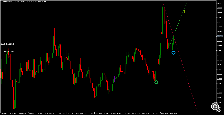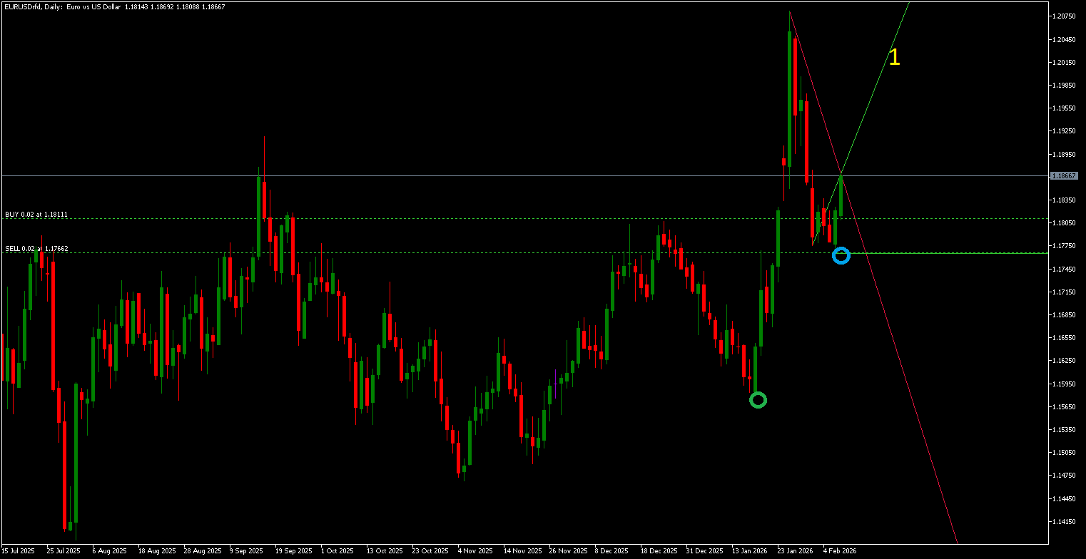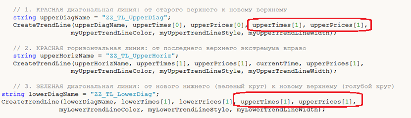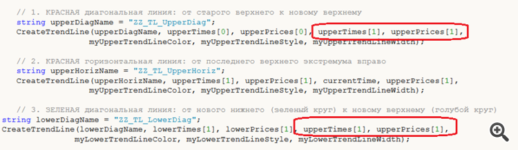 зелёную линию (под цифрой 1) поставить так, чтобы она начиналась с нижнего разворотного экстремума (зелёный круг), и проходил через следующий нижний экстремум (голубой круг)